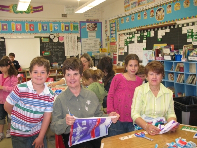 Corpus Christi teacher Daniela Visentin invited parents and grandparents of her Grade 2 students in to learn how to turn milk bags into bed mats for Haiti. The Gr. 2 students initiated the milk bag collection at Corpus Christi school. Parents and grandparents joined their efforts by lending a helping hand in cutting the bags into loops while the students linked them together and rolled them into a ball. Another team of students learned the basics of crocheting the “plastic” into a bed mat.