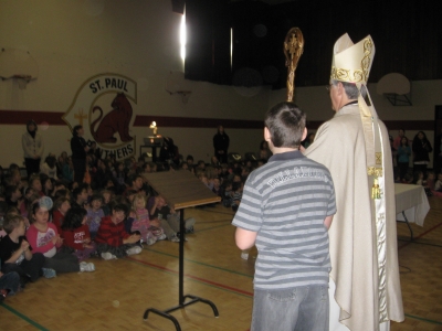 This past week, the staff and students of St. Paul the Apostle School in Coniston, welcomed in the New Year at a Celebration of the Eucharist in the gym with Bishop Noel Simard. The theme of the Mass was Responsibility and Bishop Simard spoke eloquently about our duty to “respond” to the teachings of Jesus Christ. The whole school community participated by sharing the readings, the intercessions, presenting the gifts and singing. It was a joyful celebration.