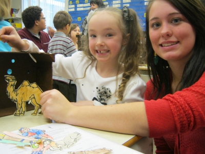 St. Charles College student, Jamie Rieux and Grade 1 student Mia Woodbury at St. Bernadette Catholic School are working together to complete a very special project: a reproduction of the manager where Baby Jesus was born. This is a yearly tradition between the two schools in which older student is paired off with a younger partner to create a beautiful replica manger which students are so proud to bring home and share with their families.