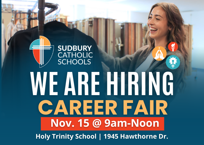Are you ready to join a team that is passionate about shaping the future? At Sudbury Catholic Schools, we are committed to providing an inspiring, supportive, learning environment for our students and we want you to be a part of it. Bring your resume, meet our dedicated team, and discover all the incredible opportunities we have to offer.